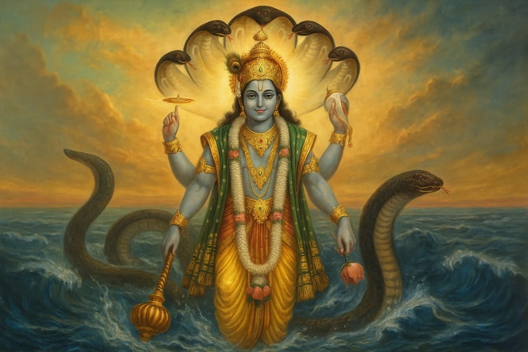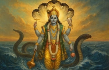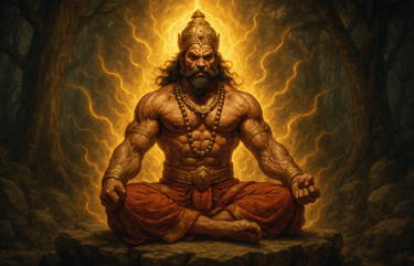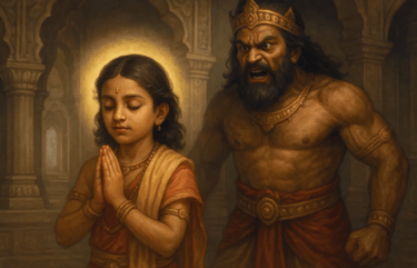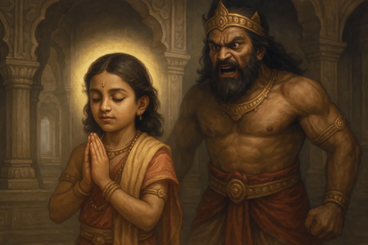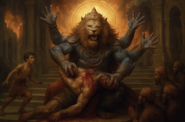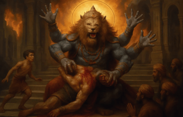Prahlad, a devoted follower of Lord Vishnu, refused to worship his father, the demon king Hiranyakashipu, who demanded that all should honour him as a god. In anger, Hiranyakashipu tried many times to have Prahlad killed, but Vishnu’s protection kept him safe. At last, Vishnu appeared as Narasimha, the half-man, half-lion incarnation, and slew Hiranyakashipu at twilight on the threshold, fulfilling the prophecy and saving Prahlad.
