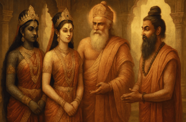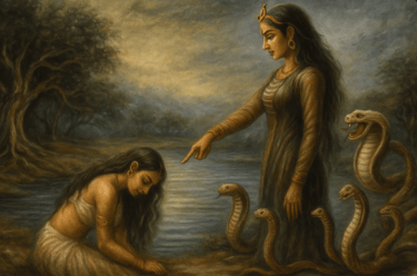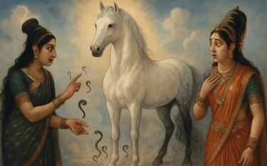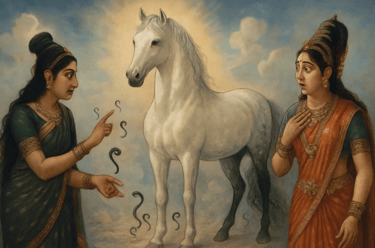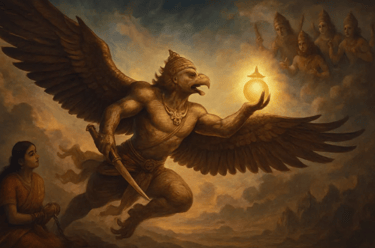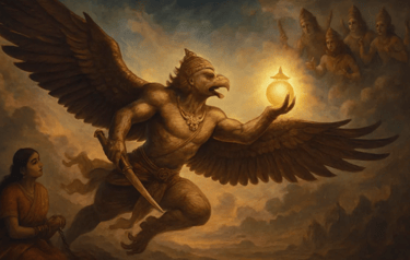 The story of Kadru and Vinatā, the wives of Sage Kashyapa, tells of their rivalry as mothers of serpents and Garuḍa. Kadru’s deception led Vinatā into slavery, until Garuḍa, born of her, freed her by seizing the nectar of immortality from the gods. Their tale symbolises the eternal struggle between deception and truth, bondage and liberation.